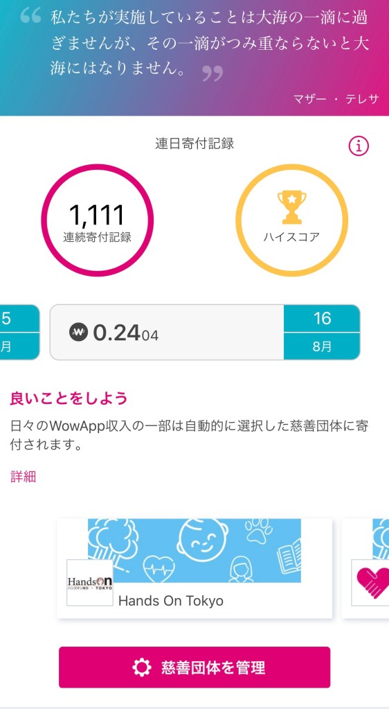wowappというアプリで毎日寄付をしています