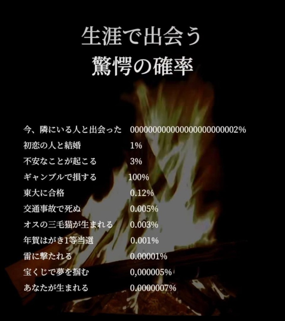 「その1/3ってどのくらいだかわかりますか? 80歳まで生きたとして、9733日ですよ。あなたが、一生の間に自由にできる1/3の時間は9733日ですよ。でもこの中には、あなたが赤ん坊であった時と、老いてからの寝たきりの時間までが含まれています。 あなたが、自分の意志で活動できる時間はさらに短いものとなって、およそ3650日です。そうです、明日のことを憂いても仕方がないのです。いまの人生を楽しみましょう。限りある命の時間を無駄にはしたくないものです。」
