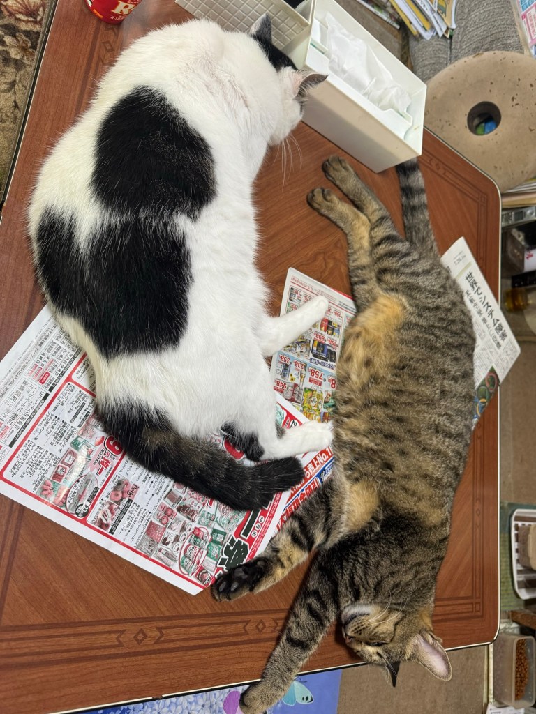 2匹だけはエアコンの風の下で爆睡しています